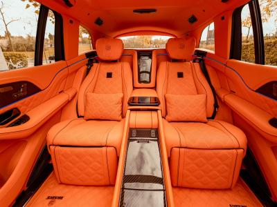 Auch für den luxuriösen Innenraum eines Maybach bietet BRABUS praktisch grenzenlose Möglichkeiten, das Fahrzeug individuell und in höchster Güte auf den ganz persönlichen Geschmack des Fahrzeugeigners abzustimmen. Als Kontrast zur schwarzen Lackierung fertigte die hauseigene Sattlerei des Veredlers ein edles Brabus fine leather Interieur in leuchtendem Leonis Orange an. Das besonders weiche und atmungsaktive Leder auf den Sitzbahnen, den Türverkleidungen und dem gesamten Boden der Kabine ist millimetergenau quadratisch abgesteppt und perforiert. Im Fond integrierten die Brabus Interieurdesigner eine maßgeschneiderte Business-Mittelkonsole mit zwei ausklappbaren Tischen.